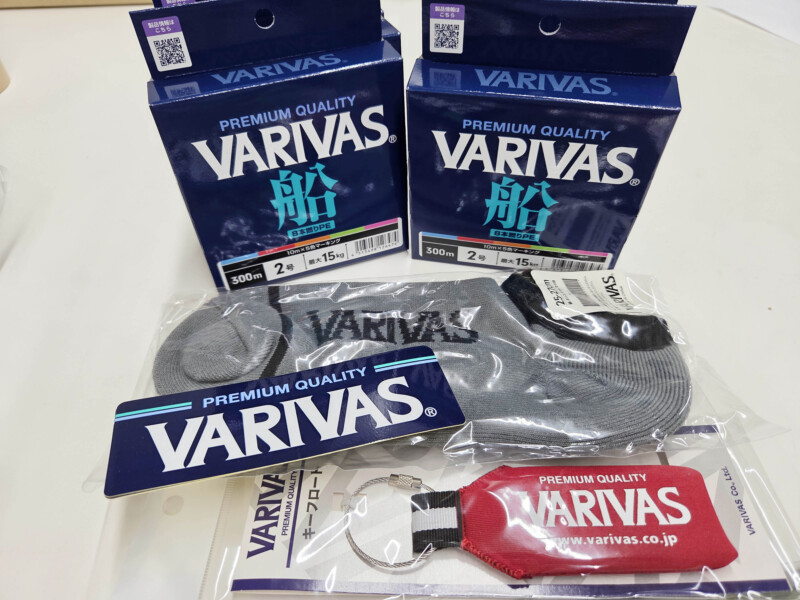 VARIVAS船PE8 300m2号、キーフロートレッド、くつした(グレー)、ステッカーです。